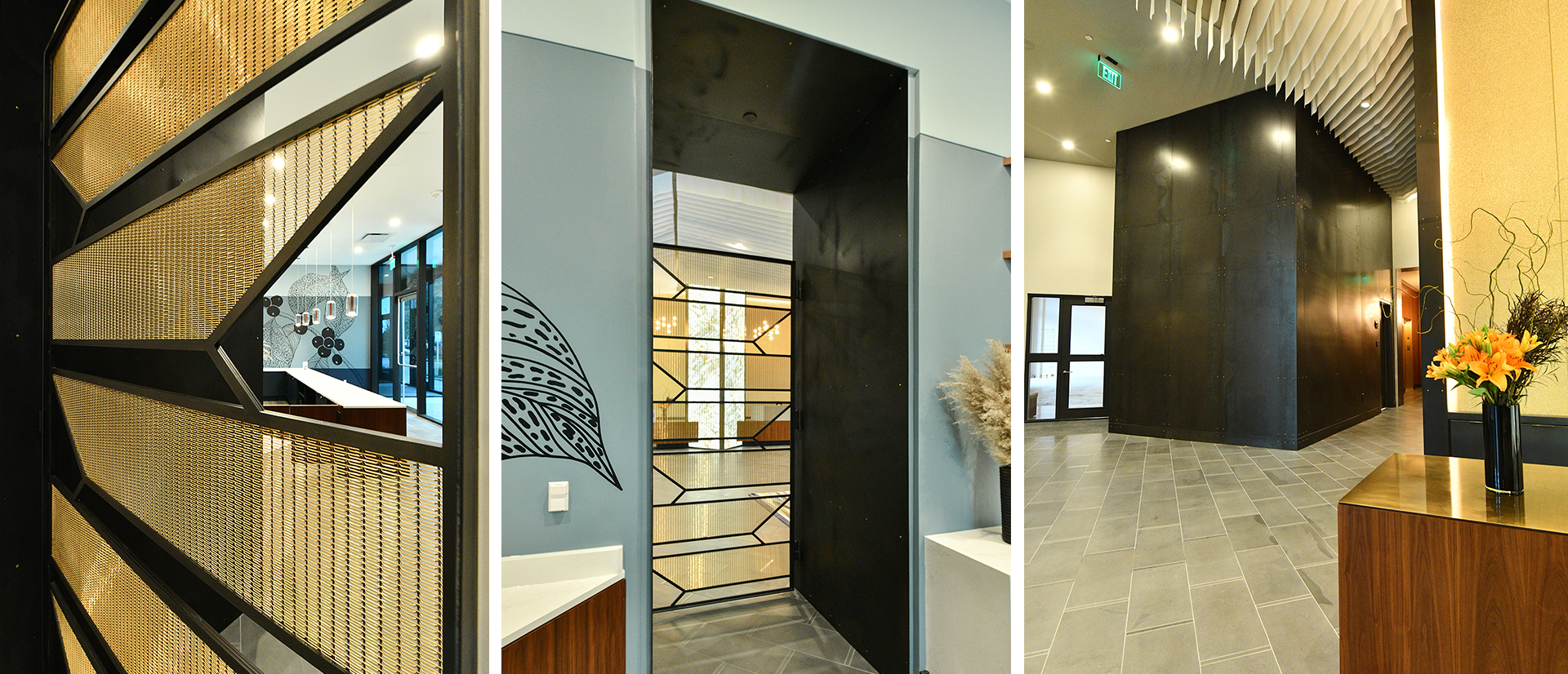 Elevator Vestibules were adorned with clear coated hot-rolled steel to elevate the building’s user experience. The metal cladding not only adds to the visual appeal but also contributes to the durability of the areas surrounding the elevator entries. The rugged and industrial finish helps creates a striking, modern look, making each trip to the elevator feel like an experience of luxury. The elevator vestibules were tailored to complement the building’s other interior metal finishes, such as the antique brass accents and other steel elements, creating a cohesive, upscale environment that reflects the high standards of AMLI Fountain Place.