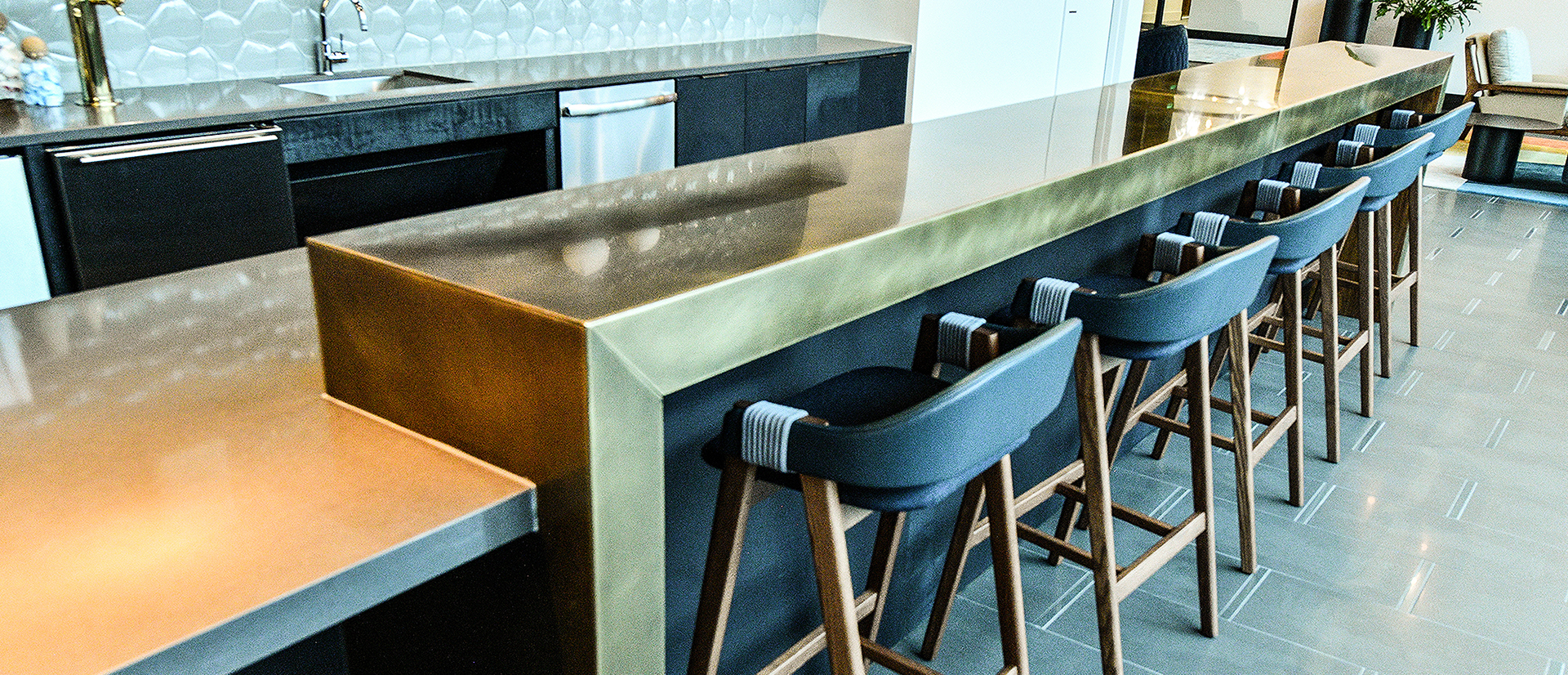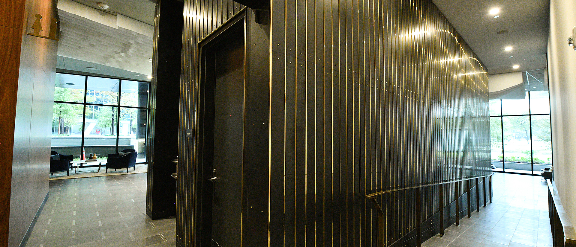 Antique Brass finishes were incorporated into countertops and art niches throughout the building to infuse the building with a timeless sense of luxury. This rich, warm metal complements the cool tones of the building’s glass and steel, introducing a contrast that catches the eye. Brass is a material that ages beautifully, providing an enduring aesthetic and a nod to classic elegance. Astro Sheet Metal’s skilled team ensured that each brass element was flawlessly integrated, giving a sophisticated edge to every eye-catching detail in the building.
