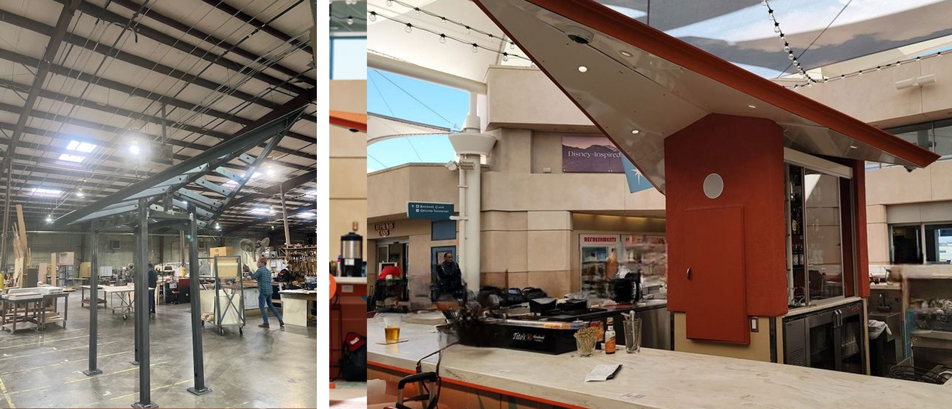 A millwork contractor specializing in custom bars and restaurants for airports needed a uniquely shaped canopy for the Cactus to Clouds restaurant at Palm Springs International Airport. The canopy featured a complex angular design, requiring precision fabrication to ensure seamless assembly in the field.