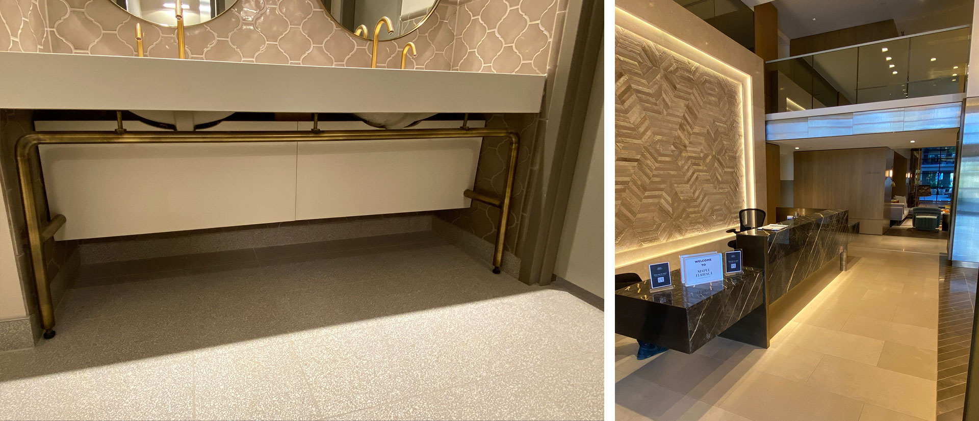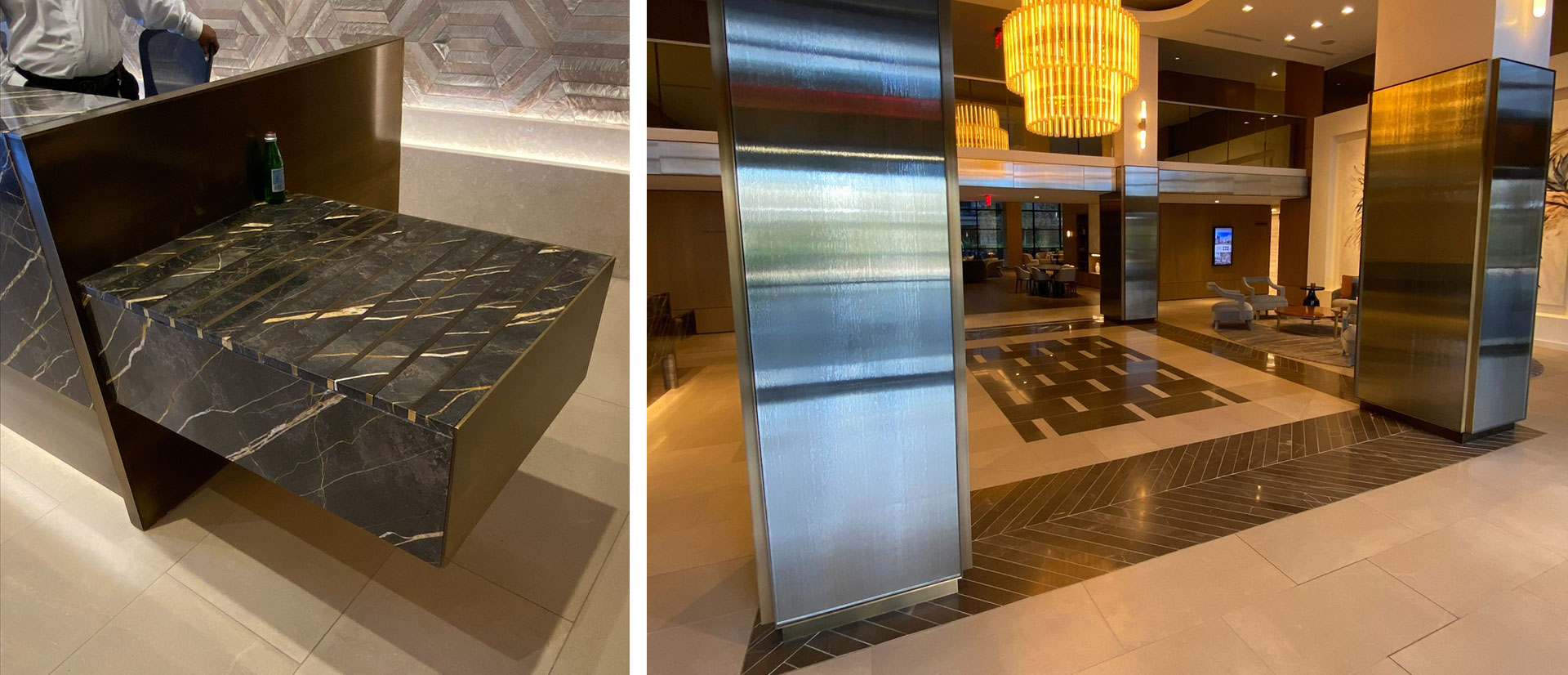 - Brushed Stainless Steel Accents: Angle accents for columns in the lobby, adding a sleek, modern touch.