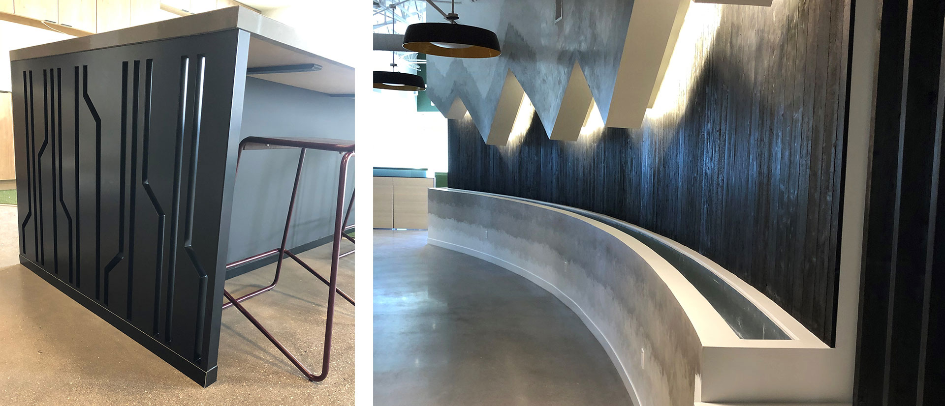 The final result was a stunning interior for the Intellicentrics headquarters, featuring a variety of custom blackened steel elements that complemented the company’s innovative and modern brand. The planters, reception desk, base cladding, steel wainscoting, accent band, and decorative island cladding all combined to create a cohesive and visually striking space that highlighted the industrial aesthetic while maintaining a sophisticated, professional atmosphere.