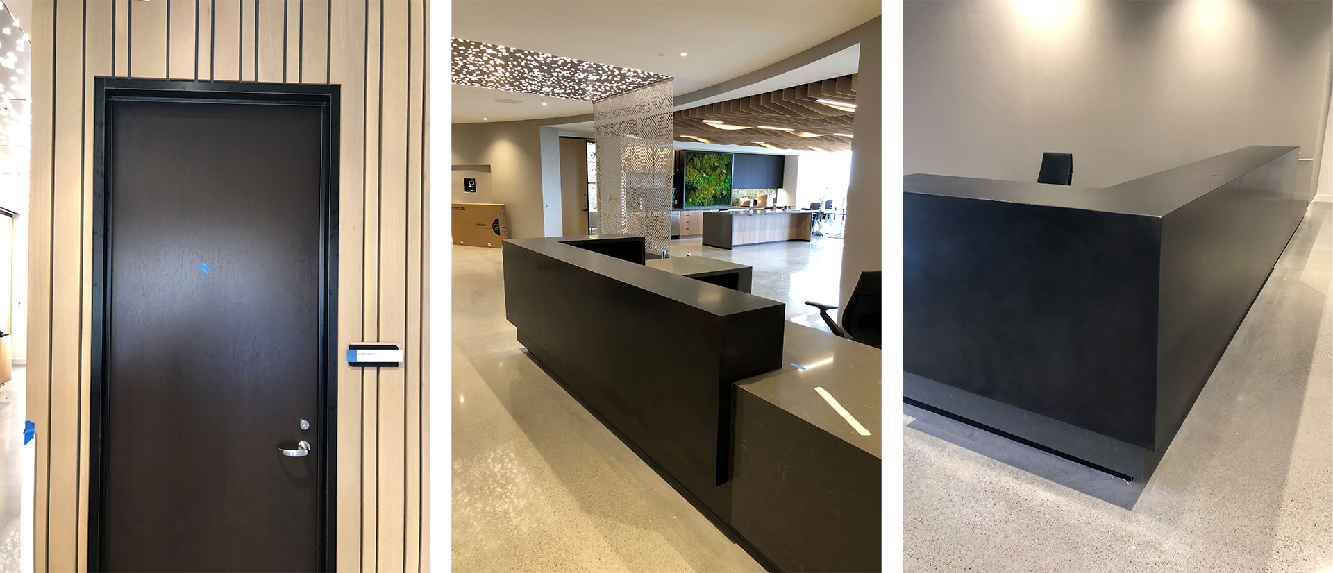 - The complexity of Custom Fabrication: One of the challenges of this project was fabricating so many unique pieces of custom-blackened steel. The planters, reception desk, base cladding, and wainscoting required meticulous attention to detail to ensure they met the architectural specifications. Astro’s experienced team leveraged their expertise in custom metalwork to successfully execute each design.