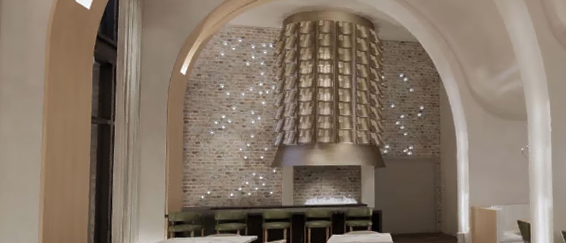 Keywords: Astro, Monarch San Antonio, Oak and Amber, custom vent hood, decorative metalwork, architectural feature metal, hospitality design, restaurant metal fabrication, curved metal panels, dark bronze finish, custom fireplace metal