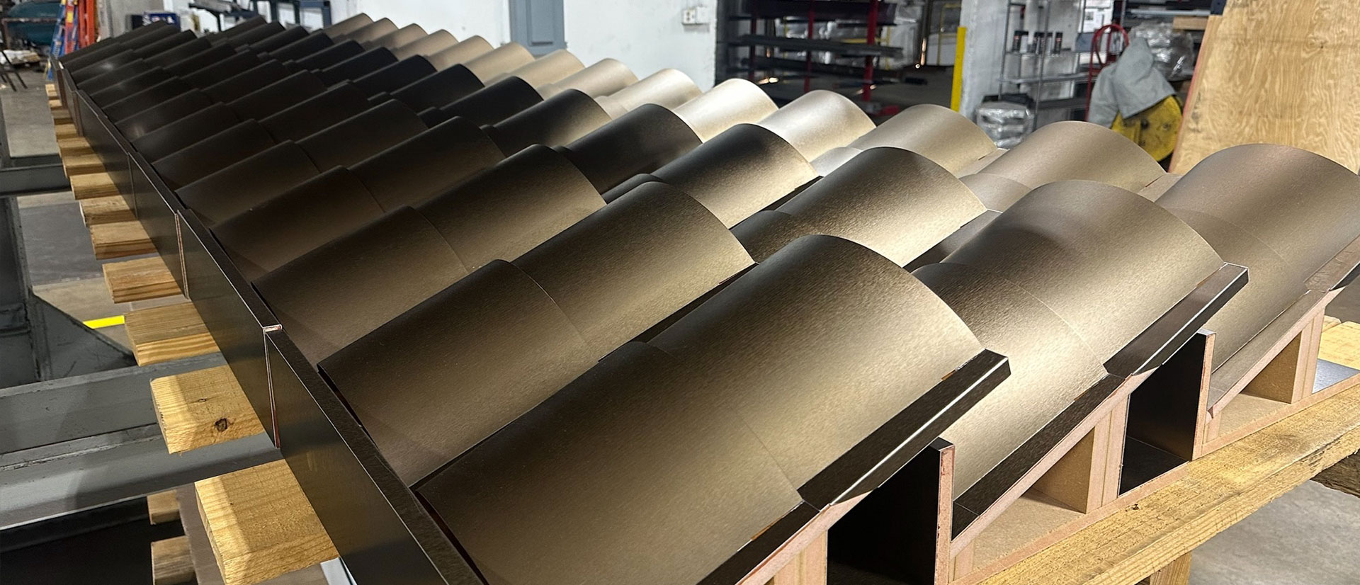 The customer provided wooden substrate pieces, each holding four curved Chemetal pieces. Astro bumped-formed each curved piece individually and adhered them to the customer’s wooden substrate pieces, taking care to ensure that the design remained consistent across all components. Astro also fabricated a large, curved bottom piece for the vent hood. This modular design allowed the unit to be safely transported from our shop in Grand Prairie to the restaurant in San Antonio and to be assembled on site.