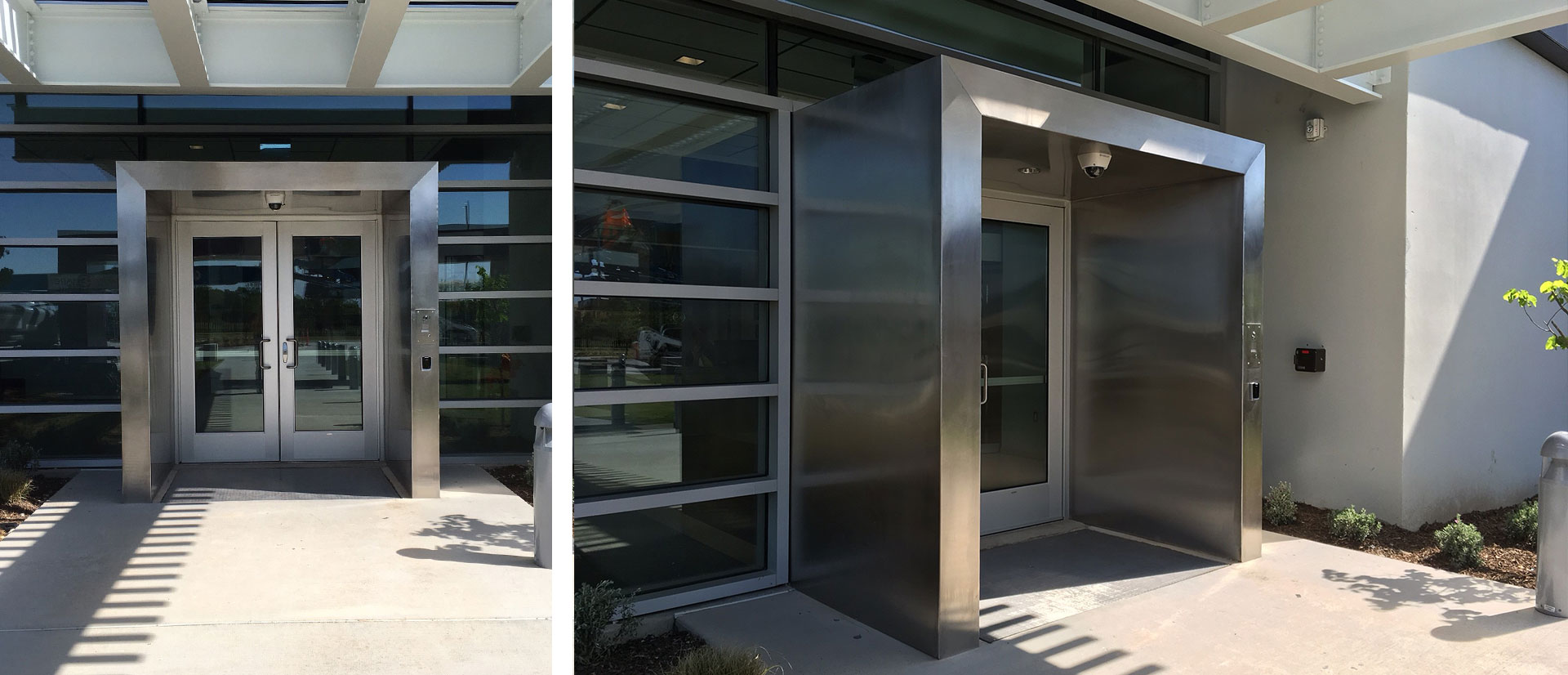 - Sheared, cut, and welded 12-gauge stainless steel components for portals.