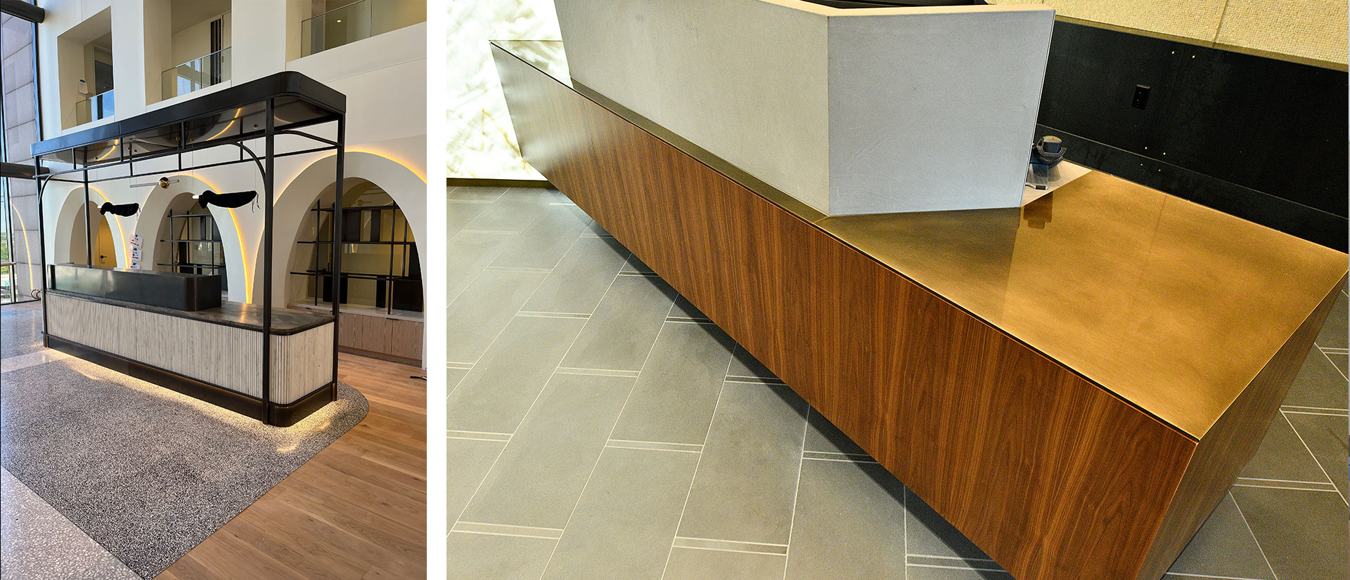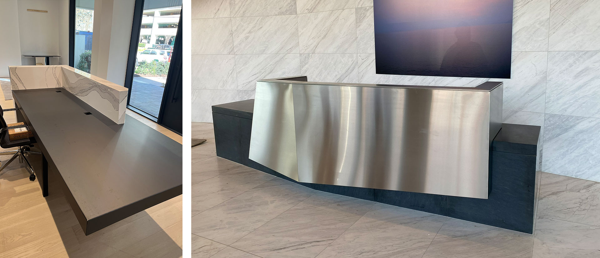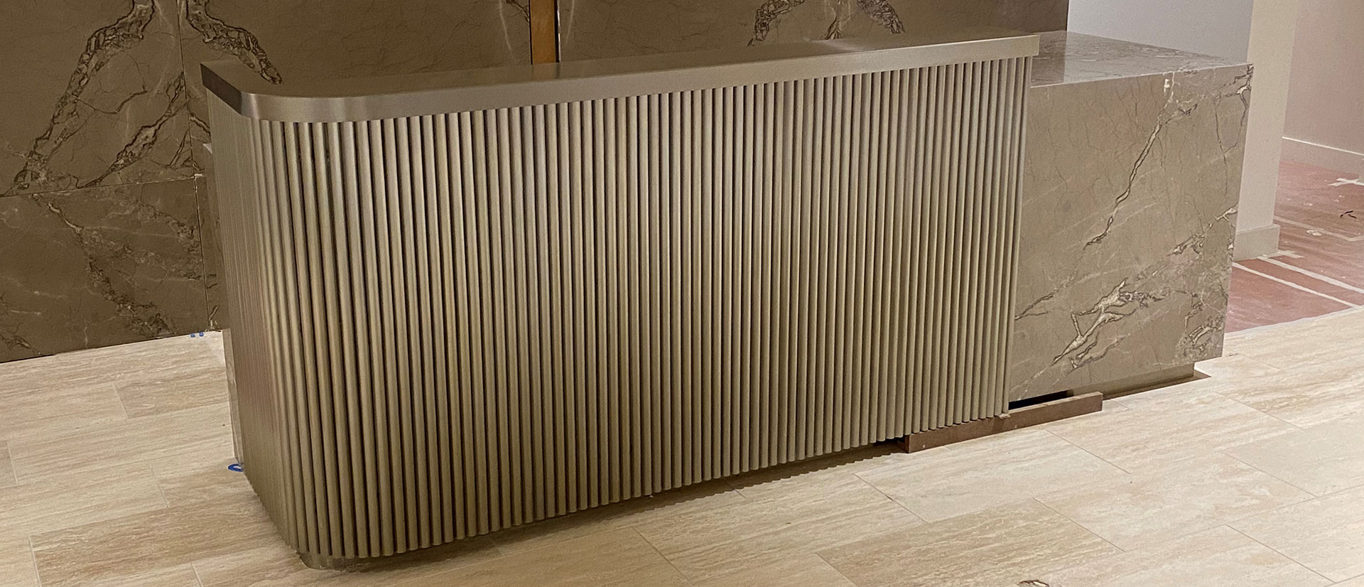 Astro creates custom reception desks that serve as bold focal points and functional workstations in commercial, hospitality, and institutional environments. Whether sleek and contemporary or warm and textural, our desks are crafted from premium metals—such as stainless steel, brass, blackened steel, and copper—and often combined with wood, stone, or glass for a refined, multi-material aesthetic. Designed to reflect your brand and architectural vision, each piece is fabricated with precision detailing, integrated technology access, and lasting durability. With Astro, your front desk becomes more than a point of entry—it becomes a statement of identity.