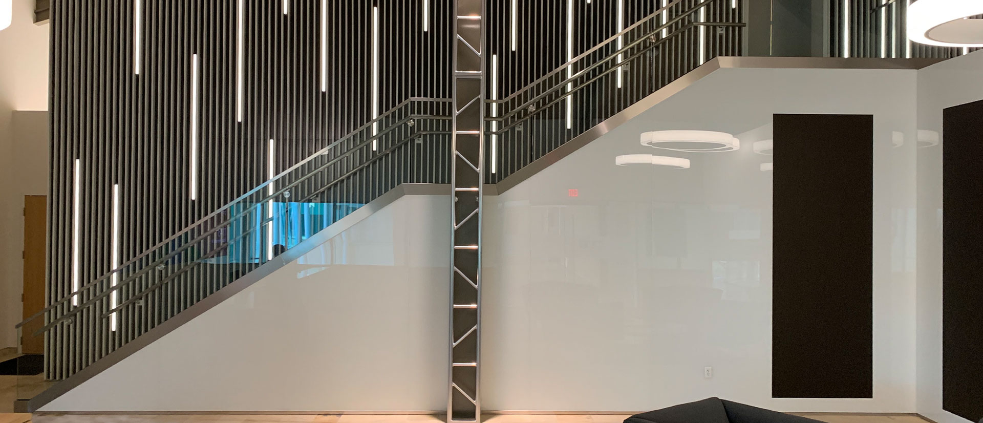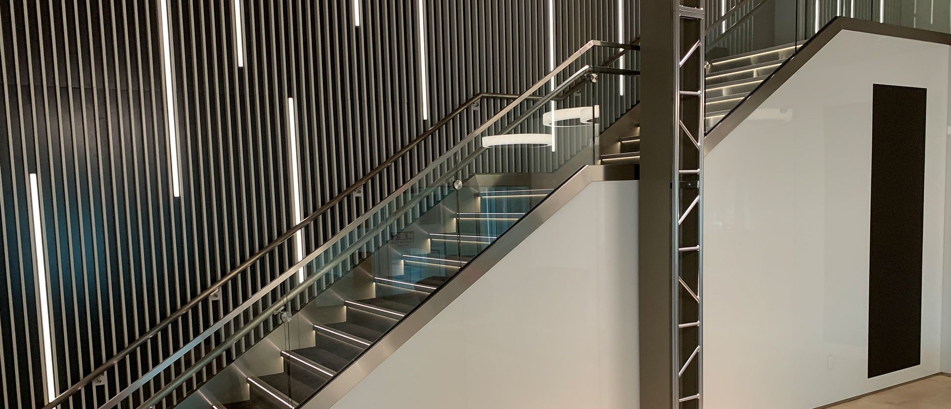 Astro was approached by a commercial glazing contractor involved in constructing the Trinity Broadcasting Network’s headquarters in Fort Worth, TX. In addition to providing a glass handrail, the contractor was responsible for cladding the stairs in brushed stainless steel, fabricating and installing a stainless steel rail to cap the glass, and producing matching stainless steel toe kicks for the stair treads.