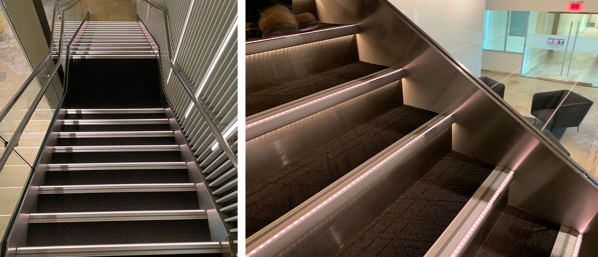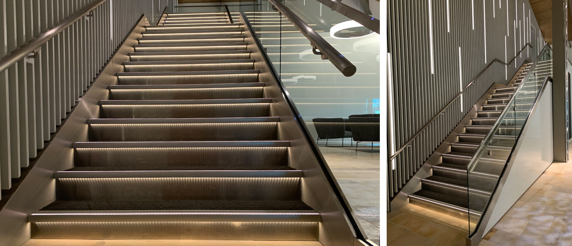 - Scope: Fabrication and installation of brushed stainless steel stair cladding, handrail caps, and toe kicks.